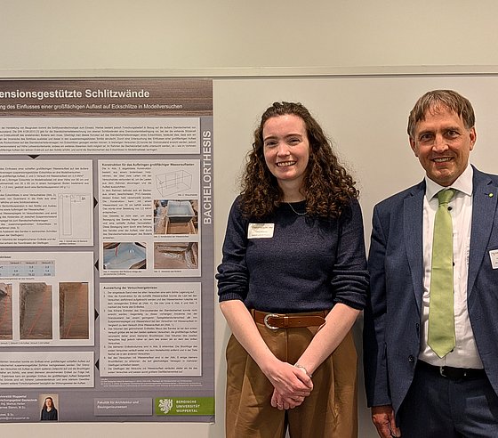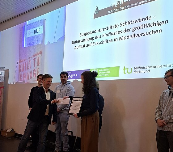 Auszeichnung: Unsere Studentin Kathrin Mittenzwei gewann mit ihrem Poster zur Bachelorthesis "Untersuchung des Einflusses einer großflächigen Auflast auf die äußere Standsicherheit suspensionsgestützter Schlitzwandlamellen in Modellversuchen" den diesjährigen RuhrGeo-Tag Nachwuchspreis der Firma HUESKER Germany. Wir gratulieren herzlich zu diesem Erfolg!