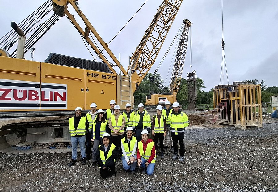 Auf der Exkursion konnten die Studierenden einen Einblick in die Schlitzwandarbeiten zur Erstellung eines Inspektionsschachtes sowie die Erstellung der Start- und Zielbaugrube für die späteren Rohrvortriebe des eigentlichen Dükers gewinnen.